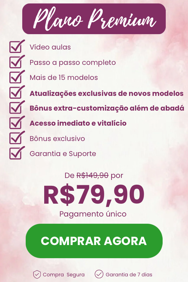 O pacote vitalício te dará acesso a todas as futuras atualizações de vídeo aulas com modelos de abadás que a Invicta Lançar. Incluindo dicas de customização além de abadás, como camisetas de academia, blusinhas do dia a dia, shorts, saia e  peças em geral. Oferta imperdível para o Plano Premiun!